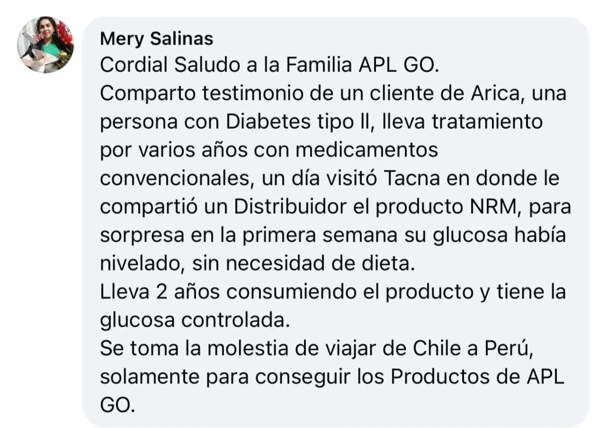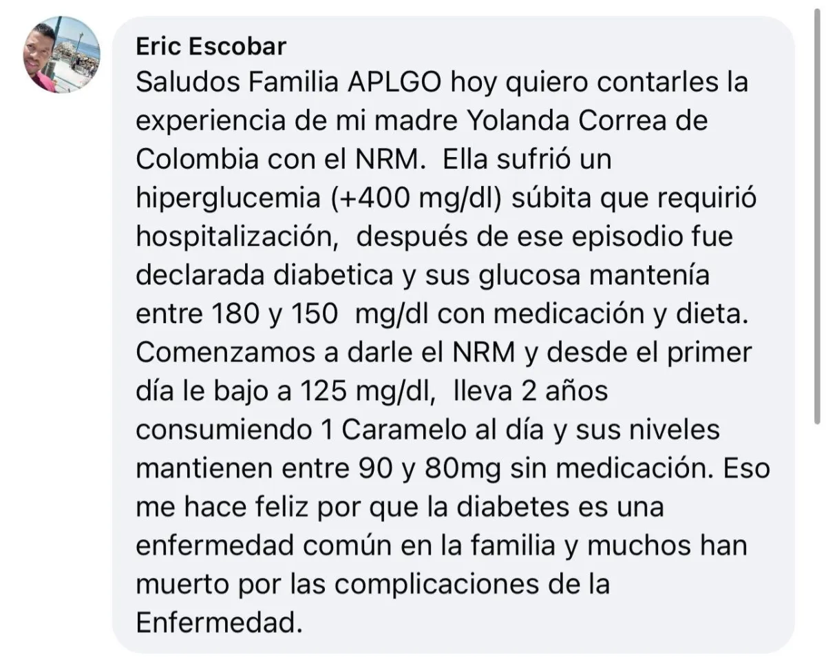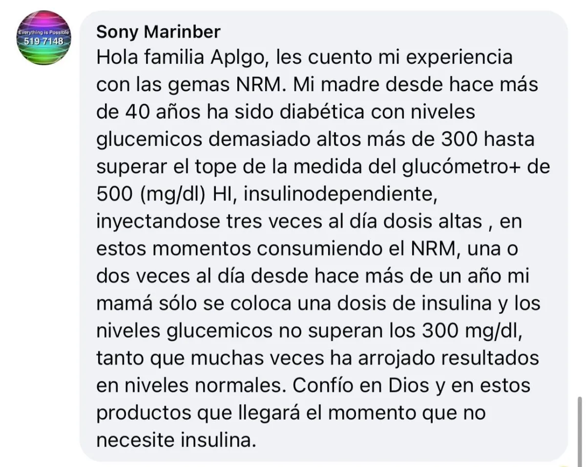 "Tenía 47 años, con el azúcar siempre por las nubes. Después de usar NRM por 3 meses, mis picos de glucosa bajaron, me siento con más energía y no sufro de sed como antes."